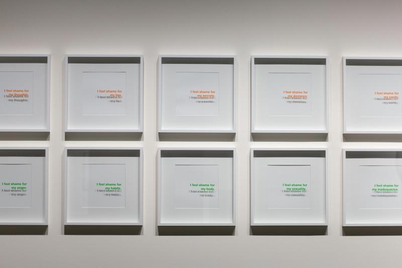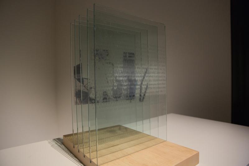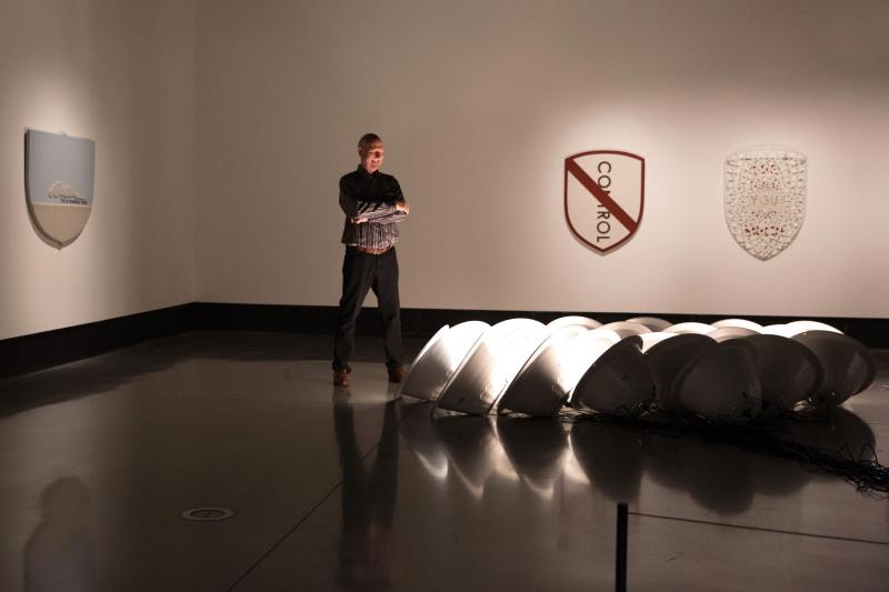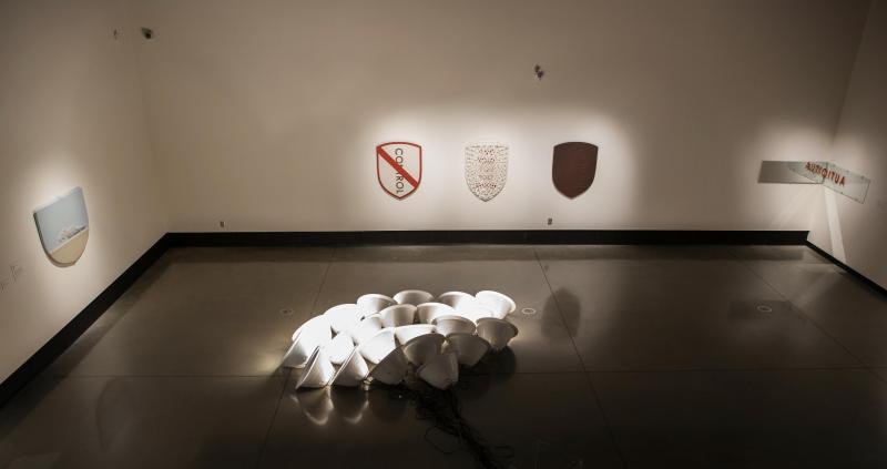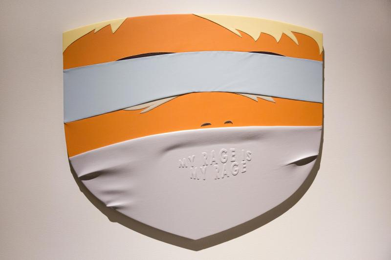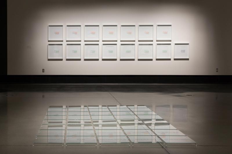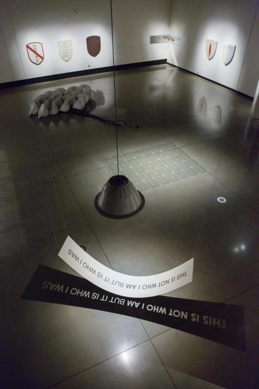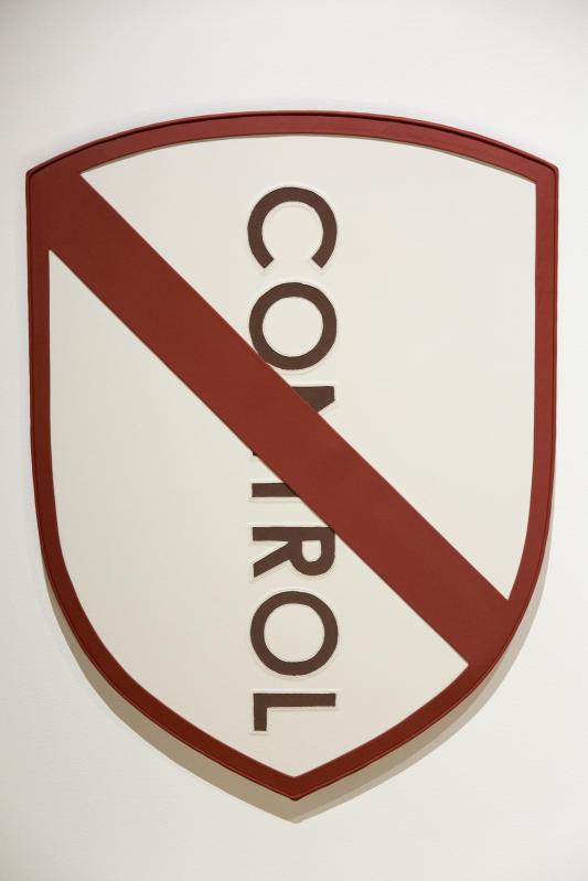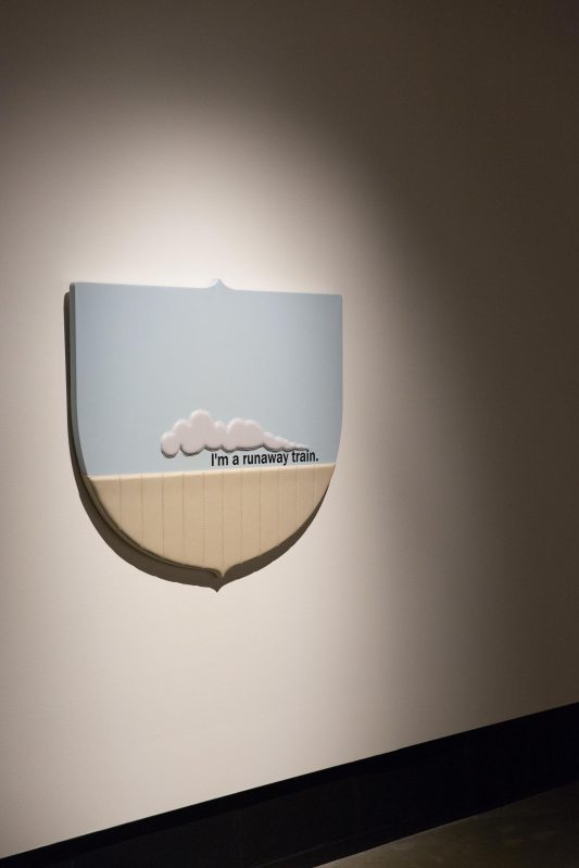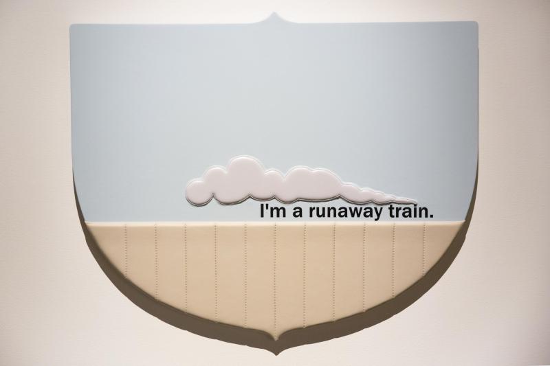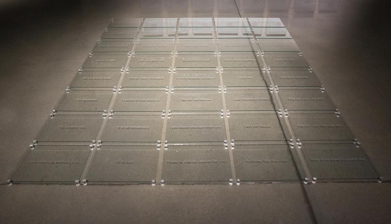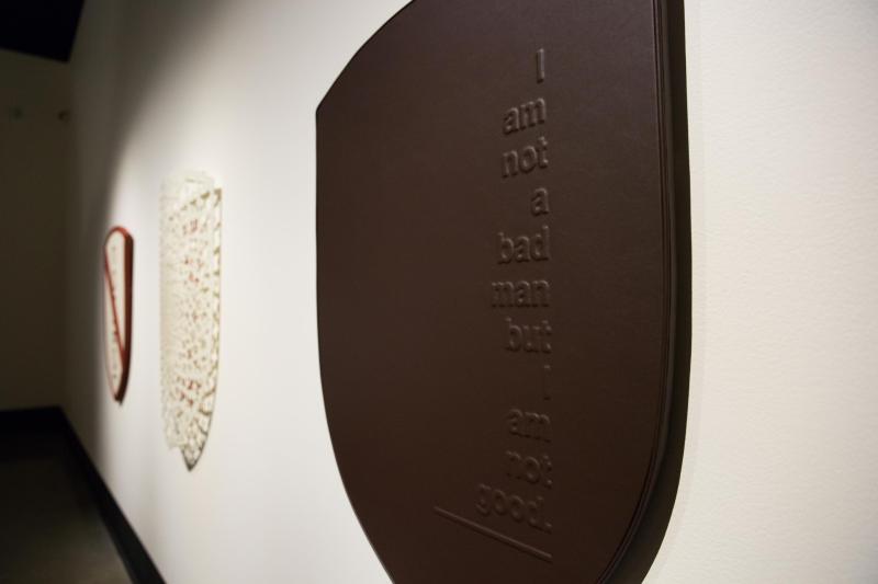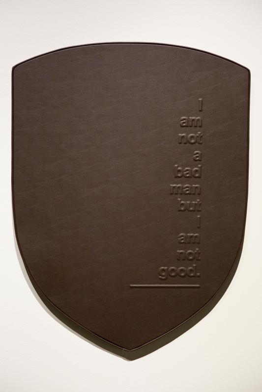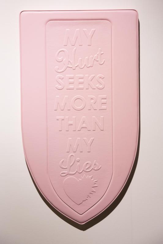 The artist’s sculptures, text works and installations bear a presence that is neither trivial nor deposable. His etched glass plates, cut steel shields and machine-stitched emblems ply human words with the language of the material itself, offering objects transformed by the marriage.