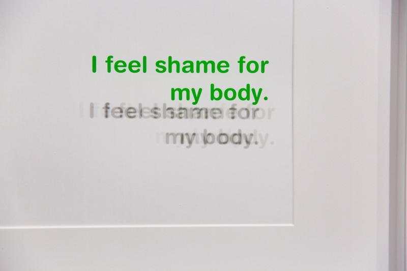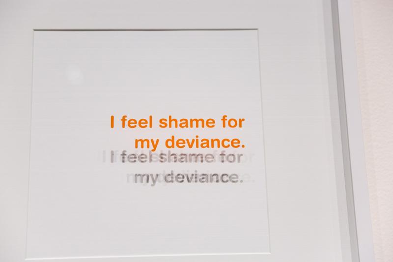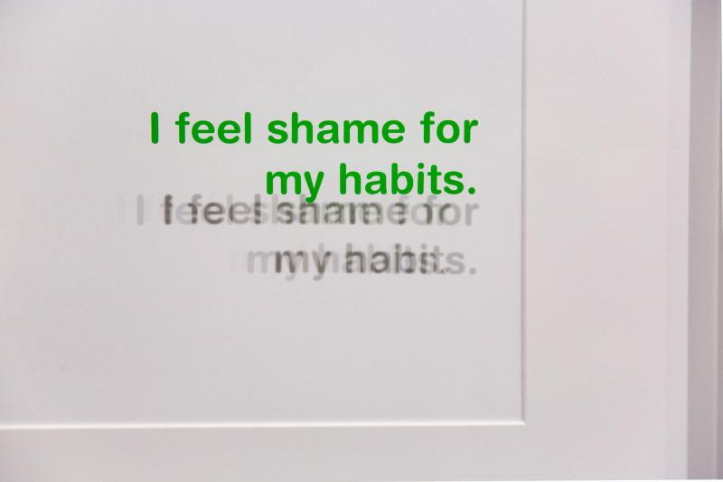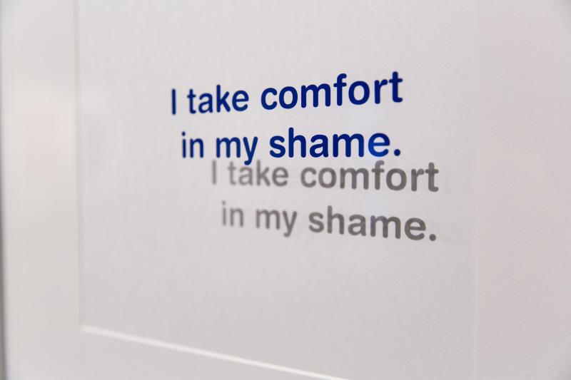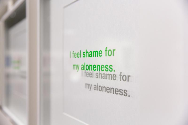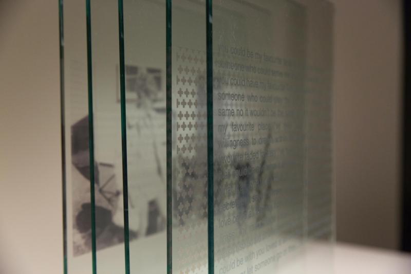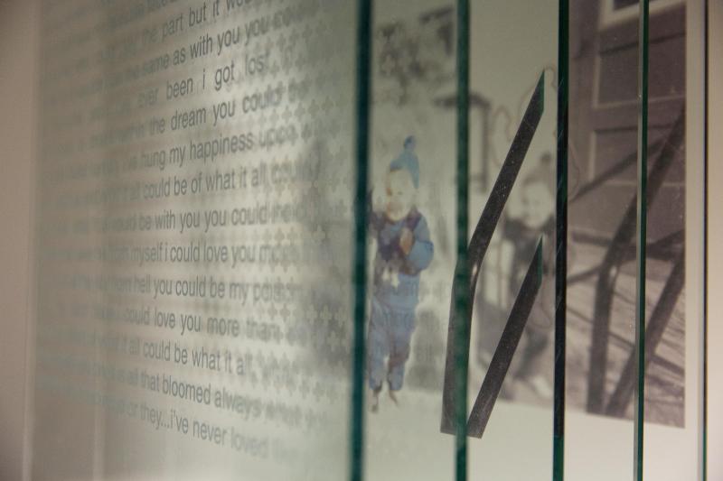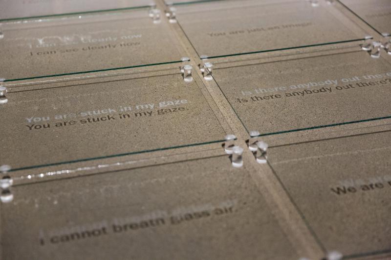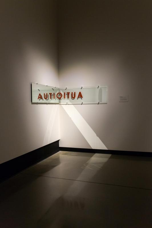 Craig Le Blanc’s materials are the stuff of industry: plate glass, mirrors, industrial lights, car upholstery… things made with machines, from places traditionally associated with men. He transforms each into a ground for linguistic fragments and adages; phrases that run the spectrum of human articulation, from confession to lament to prayer. At times they are boldly stated, at others, barely whispered.